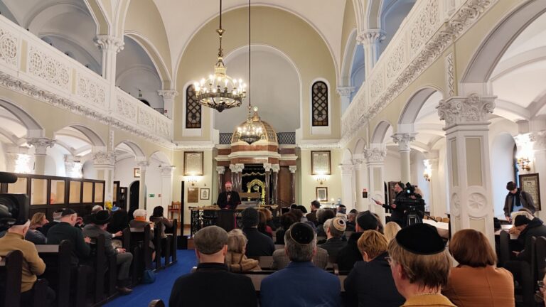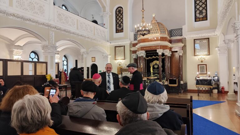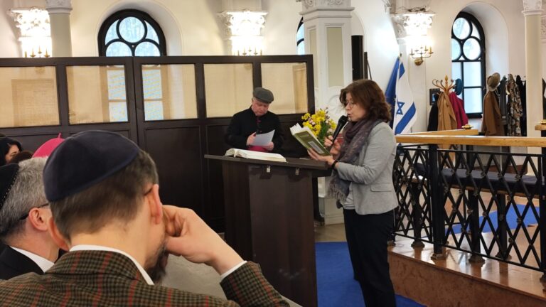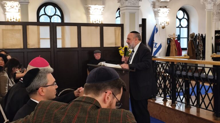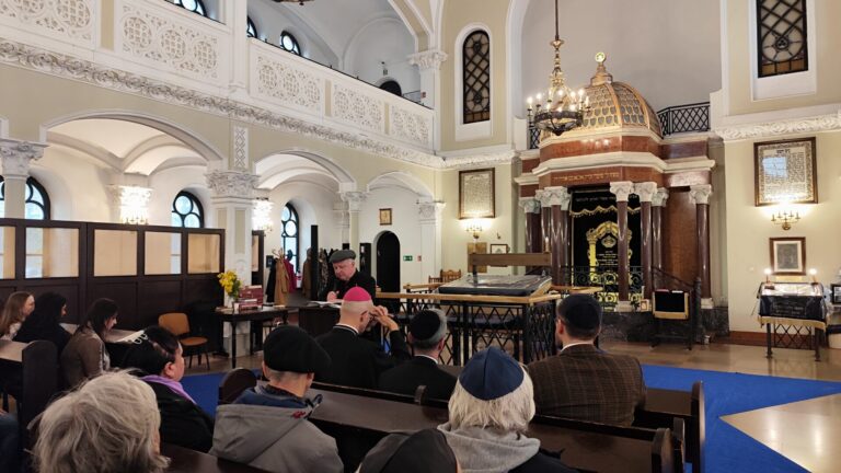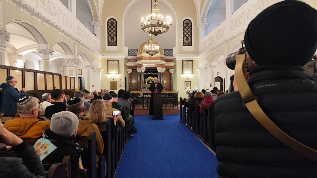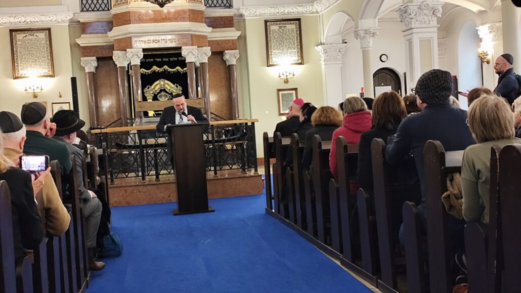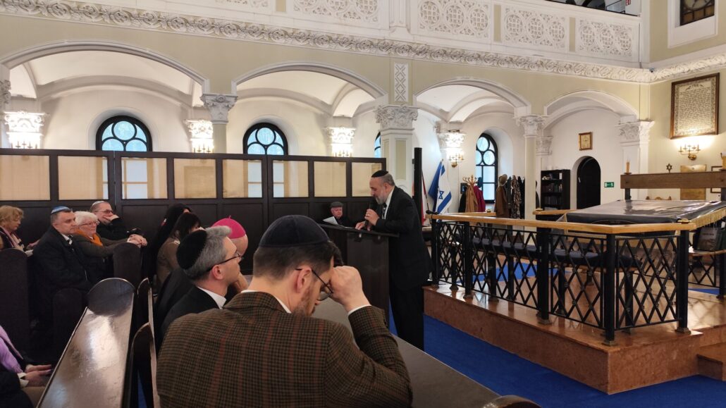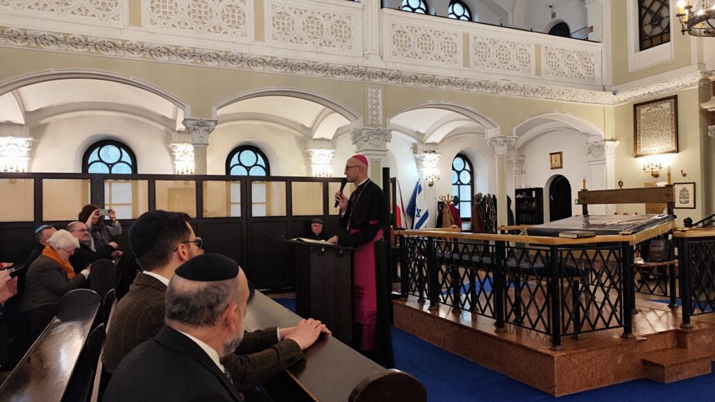 Na początku wystąpienia abp Galbas zaznaczył, że synagoga Nożyków jest jedyną zachowaną przedwojenną synagogą w stolicy. Przypomniał, że przed II wojną światową w Warszawie istniało ponad czterysta synagog i domów modlitwy, a dziś jest ich zaledwie cztery. – Ta, w której teraz się znajdujemy była jedną z pięciu największych synagog Warszawy w 1939 r. Dziś to najważniejsza, historyczna synagoga miasta – podkreślił.