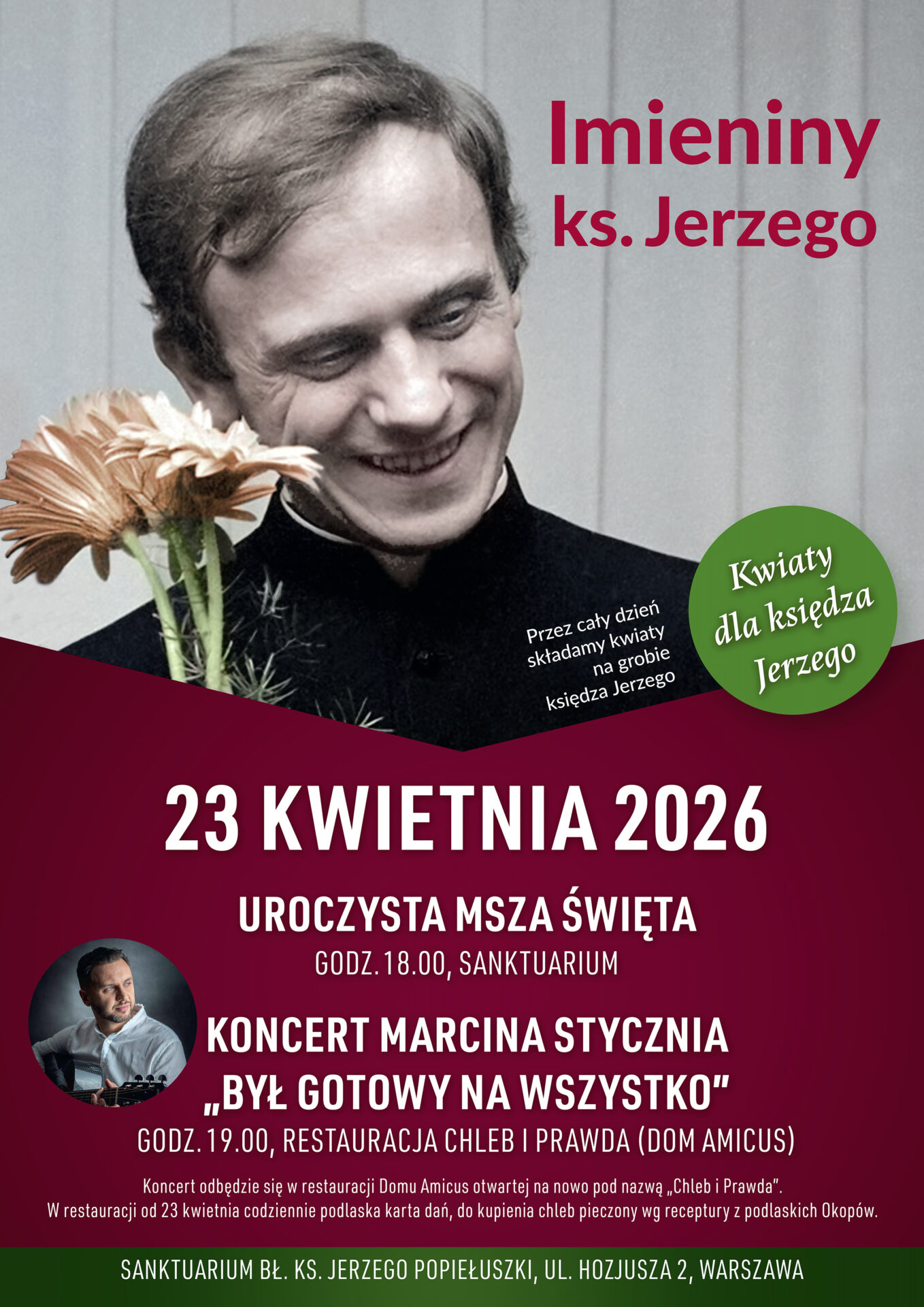 Wszyscy, którzy czują wdzięczność wobec błogosławionego księdza Jerzego Popiełuszki proszeni są o to, żeby 23 kwietnia, w rocznicę imienin Jerzego, przynieść na jego grób kwiaty. Tego dnia w Sanktuarium Bł. Ks. Jerzego Popiełuszki odprawiona zostanie uroczysta Msza a po niej odbędzie się koncert. Uczestnicy będą mogli zakupić chleb pieczony według podlaskiej receptury z Okopów.