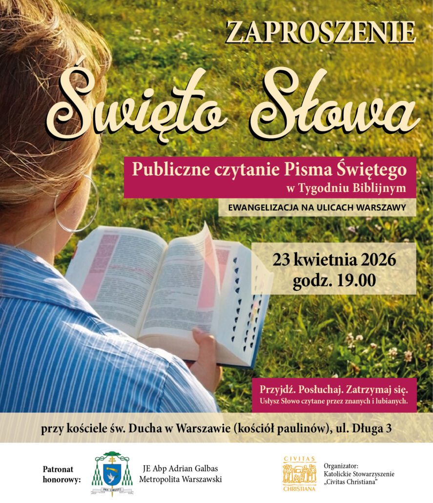 Wydarzenie odbędzie się w Tygodniu Biblijnym 23 kwietnia od godz.19.00 przy kościele św. Ducha (kościół Paulinów) w Warszawie, w przestrzeni publicznej będącej miejscem codziennego spotkania mieszkańców miasta i przyjezdnych. Poprzez obecność Słowa Bożego w sercu Stolicy chcemy zaprosić przechodniów do zatrzymania się, wsłuchania i osobistej refleksji nad Ewangelią, która – jak wielokrotnie podkreślał bł. Prymas Wyszyński – jest zawsze żywa i zdolna przemieniać człowieka oraz życie społeczne. Publiczne Czytanie Pisma Świętego będzie miało charakter uroczysty, a zarazem otwarty. Czytane będą krótkie fragmenty Ewangelii według św. Mateusza, która stanowi część zakresu merytorycznego 30. edycji Ogólnopolskiego Konkursu Wiedzy Biblijnej organizowanego przez „Civitas Christiana”.