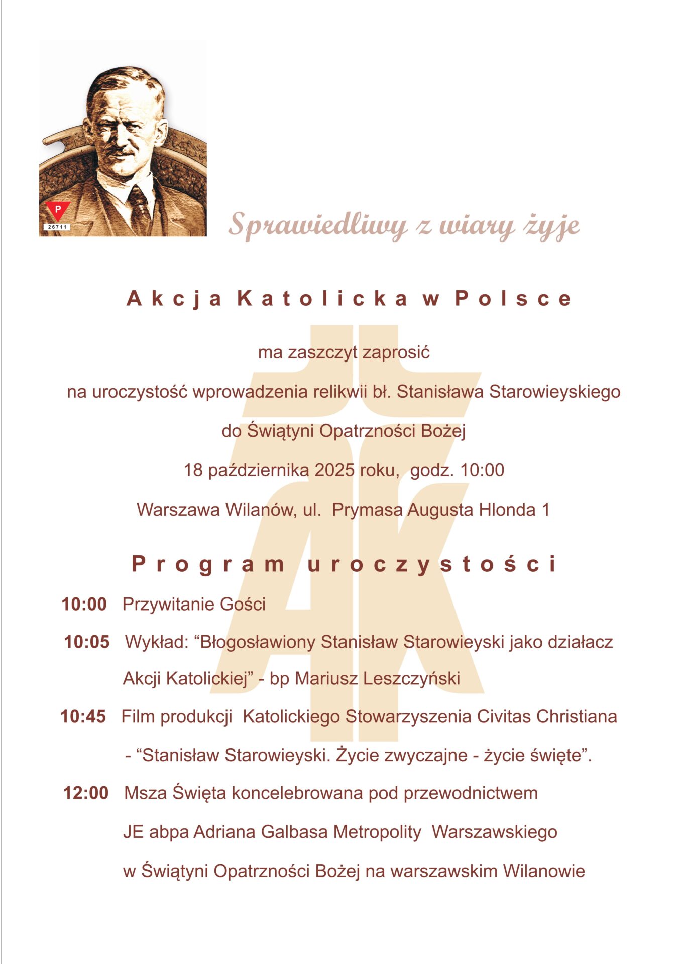 - 10:00–10:45 „Bł. Stanisław Starowieyski jako działacz Akcji Katolickiej” – wykład biskupa Mariusza Leszczyńskiego